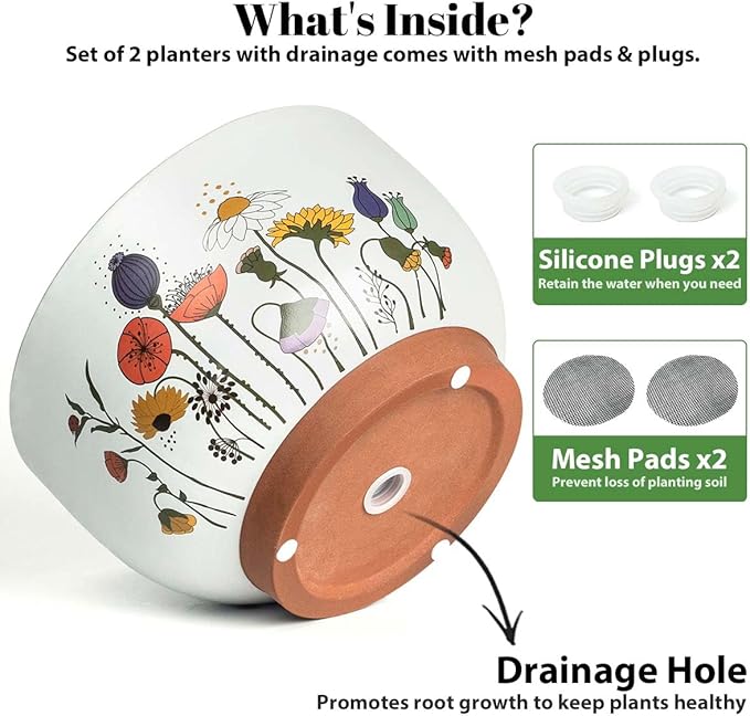 - 【2 DIFFERENT SIZES】Large plant pot: 7.87" D x 5.12 "H. Small plant pot: 5.91"D x 4.02"H. Package: contains 2 ceramic flower pots, 2pcs mesh pads & 2pcs silicone plug . (NOT INCLUDE PLANTS)