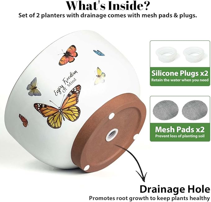 - 【2 DIFFERENT SIZES】Large plant pot: 7.87" D x 5.12 "H. Small plant pot: 5.91"D x 4.02"H. Package: contains 2 ceramic flower pots, 2pcs mesh pads & 2pcs silicone plug . (NOT INCLUDE PLANTS)