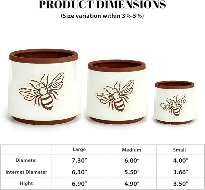 YBX Terracotta Pots Inch with Drainage Holes, Bee Decor, Ceramic Pots for Indoor Plants Flower Pots Outdoor, Succulent, Herbs, Snake Plants (White, 8+6+4 Inch)