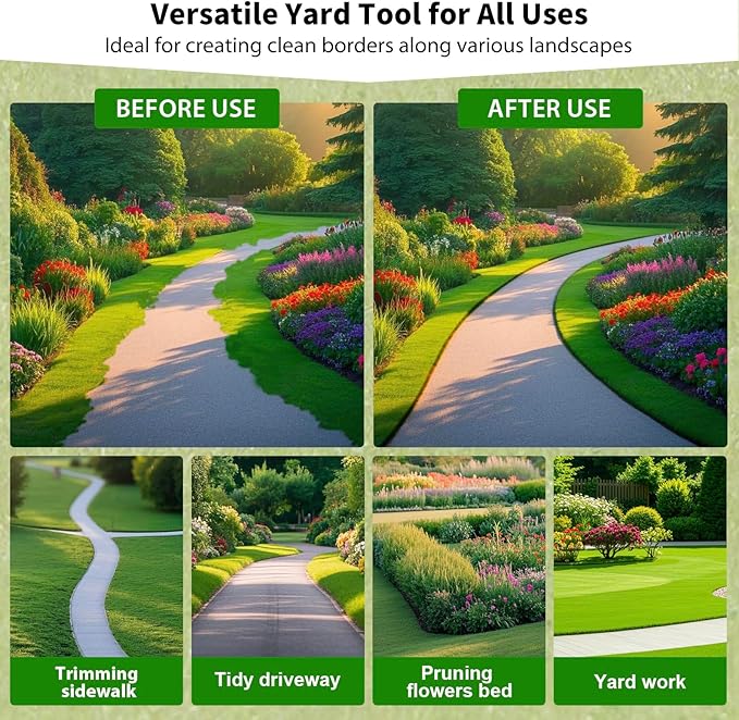 - Versatile Lawn Tool for Landscaping Projects: This versatile lawn edger excels in multiple landscaping applications, including sidewalks, yards, and driveway edges. It's a must-have addition to your collection of yard tools, enabling you to achieve professional results effortlessly in all your landscaping projects.